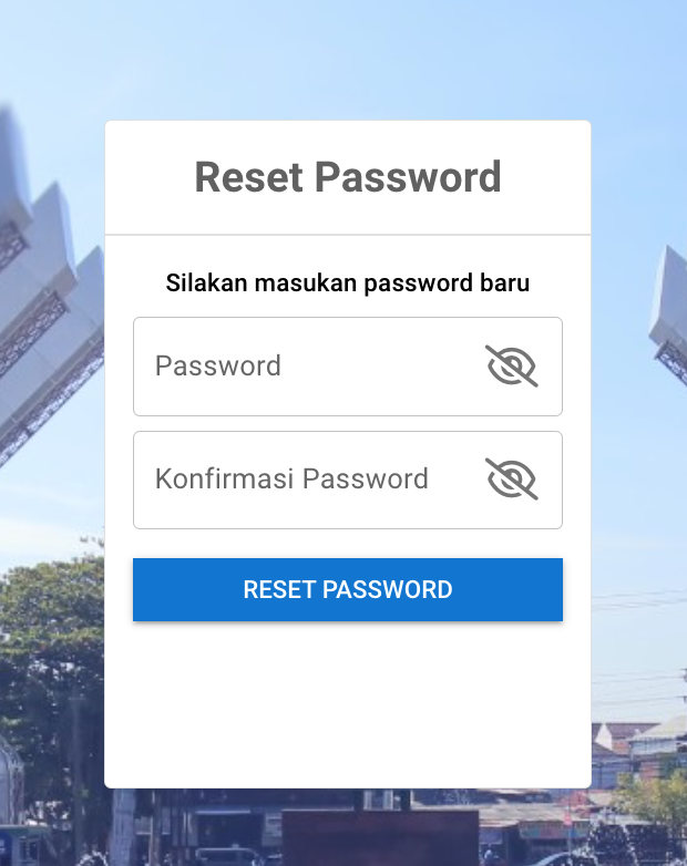 Pengguna dapat mengganti password dengan memasukkan password baru dan konfirmasi password kemudian menekan RESET PASSWORD. Jika sudah berhasil melakukan reset password dapat kembali ke halaman login dan memasukkan password baru.