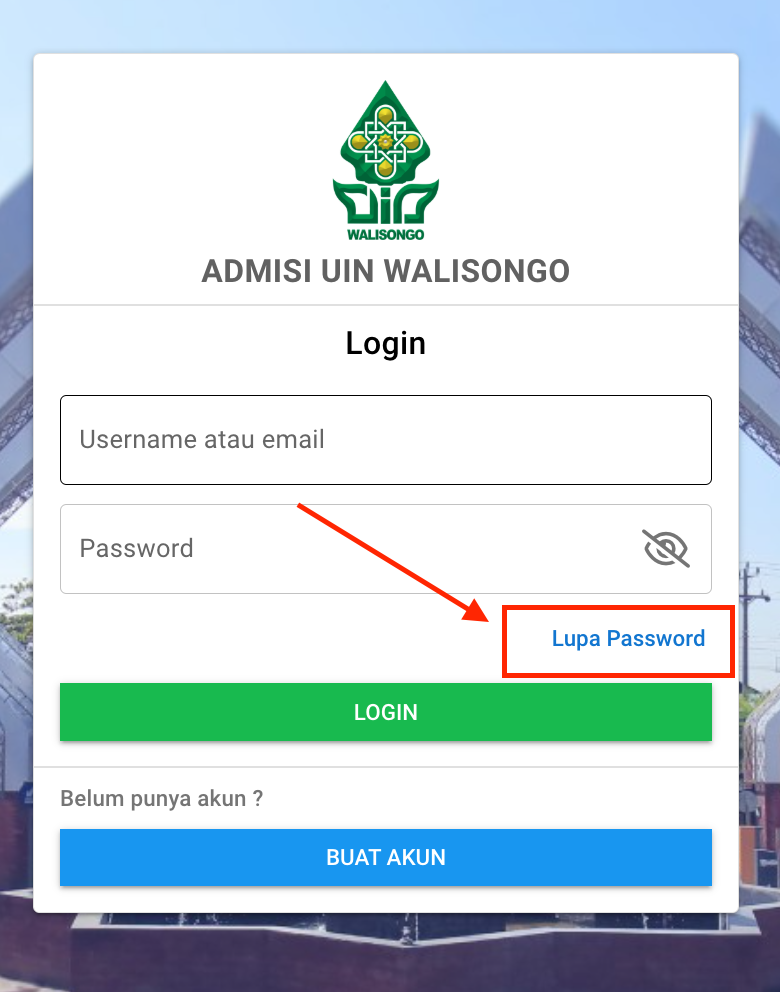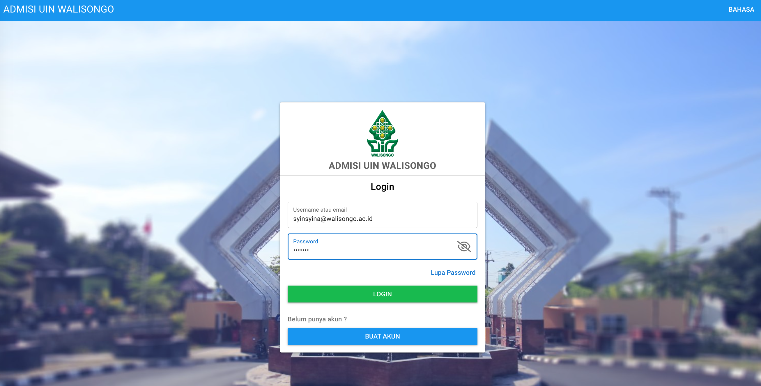 Untuk pengguna yang sudah memiliki atau sudah berhasil melakukan pendaftaran bisa login ke akun admisi.walisongo.ac.id dengan memasukkan username/alamat email dan password di halaman login dan menekan tombolĀ Login.