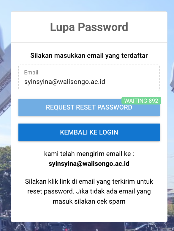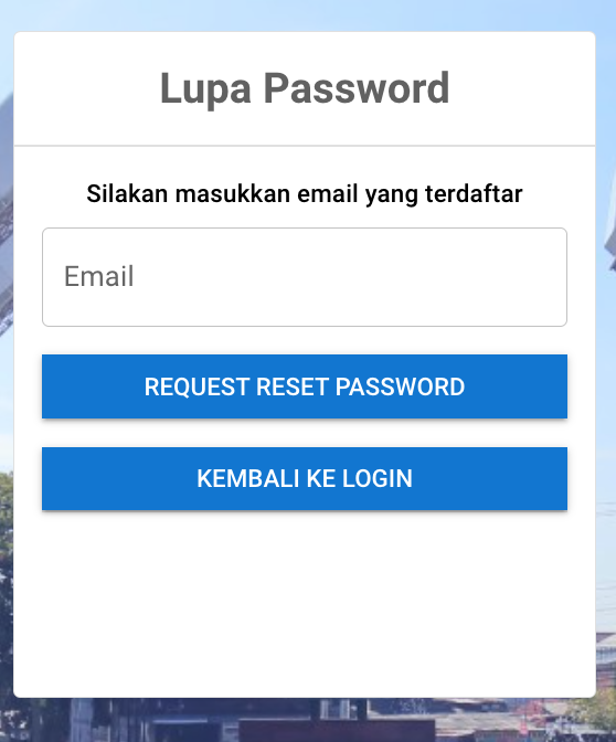 Pengguna bisa memasukkan alamat email yang sudah terdaftar di sistem kemudian dimasukkan alamat email, dan menekan tombol REQUEST RESET PASSWORD.