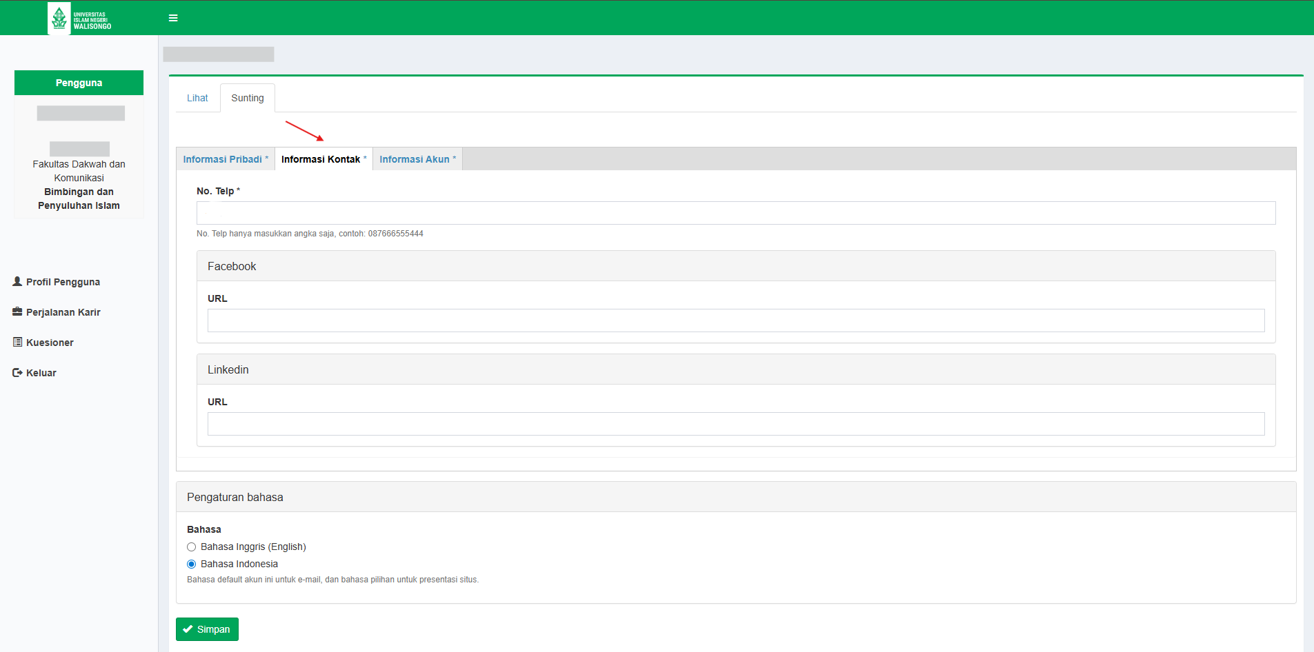 Jika sudah mengganti nomor telepon dan mengisi Link Profil untuk Facebook dan Instagram, Jangan lupa untuk klik "Simpan" agar perubahan dapat tersimpan.