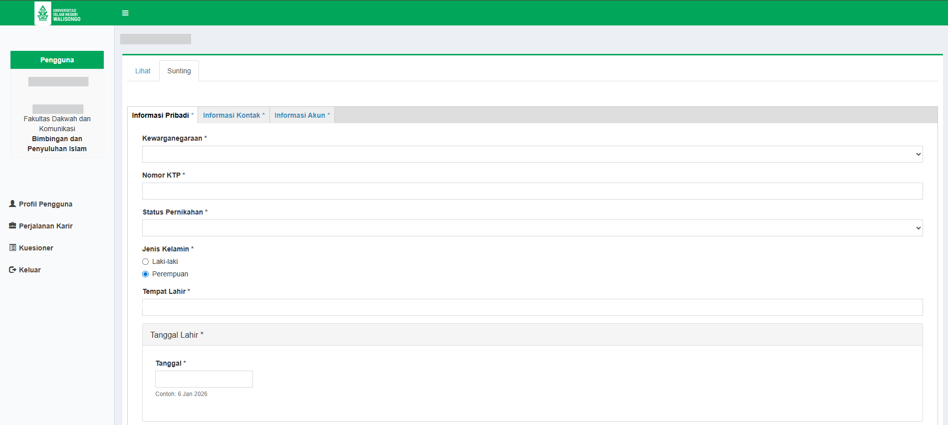 Disaat ingin mengubah isi Profil Pengguna, jangan lupa klik bagian Sunting untuk mengubah data diri yang tidak sesuai (apabila sebelumnya terjadi kesalahan dalam informasi pribadi). Jika sudah selesai mengubah data diri yang sesuai jangan lupa untuk klik "Simpan".